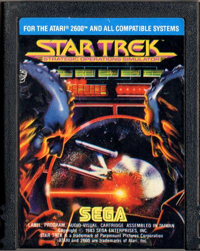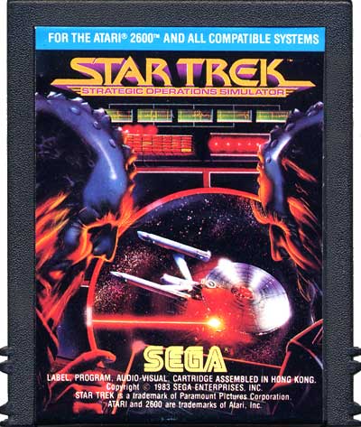 version b)* R ©1983, black label, four line legal notice, assembled in Hong Kong, illustration of Klingons in a ship, EL: “Star Trek SOS” in yellow 3-D letters, CART: “Sega”?, grip case