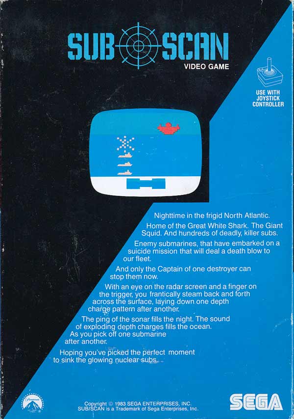 1) ©1983, blue and black box, illustration of robots inside a submarine, Sub-Scan in blue letters, Paramount logo on back, no Made in