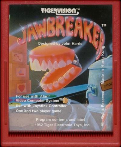 Jawbreaker Cartridges version a)* C ©1982, illustration of chomping teeth, Made in Taiwan, EL: red, CART: red plastic, CART2 version b)* C ©1982, illustration of chomping teeth, Made in Taiwan, EL: red, CART: red plastic, CART3 NOTE: versions a & b have the same main and end labels, but the cartridge itself is different