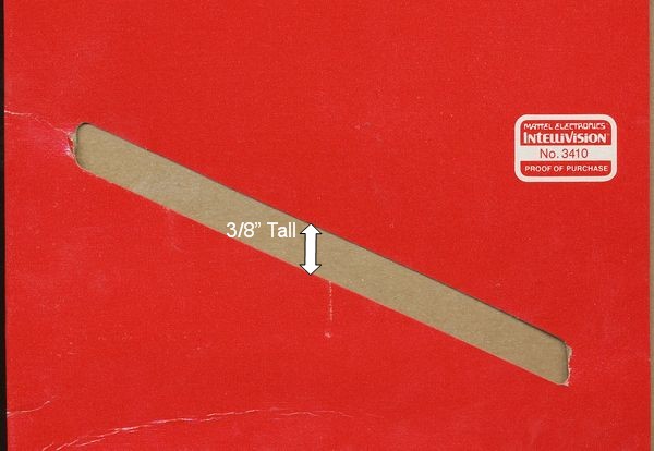 | Mattel Box Variations Besides normal box variations when it comes to where a box is printed, or how many languages it has, I discovered a physical variation with the box that seems to have no other differences. Slit: We are referencing the slit where the manual and overlays fit. This first scan below shows what I call the “small” slit. The opening is 3/8” tall as shown with the designated arrows. The second scan, which shows the “large” slit has an opening of 3/4”tall, again as shown with the designated arrows.
